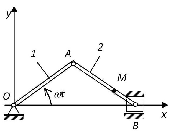 ❓Consider a crank-slider mechanism (1-crank, 2-connecting rod). This mechanism was first used in antiquity, in Roman sawmills. There, the rotation of the wheel, driven by the force of falling water, was converted into the back-and-forth motion of the saw blade. In this case, the crank rotates with a constant angular velocity omega=10 rad/s. Find the equations of motion, the equation of the trajectory, and the speed of point mathrm{M} of the connecting rod ifmathrm{OA}=mathrm{AB}=90 mathrm{~cm}, mathrm{MB}=(1 / 3) mathrm{AB}.